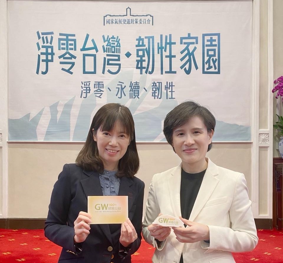 ▲由台灣綠能公益發展協會創辦人陳惠萍(左)致贈行政院副院長鄭麗君(右)