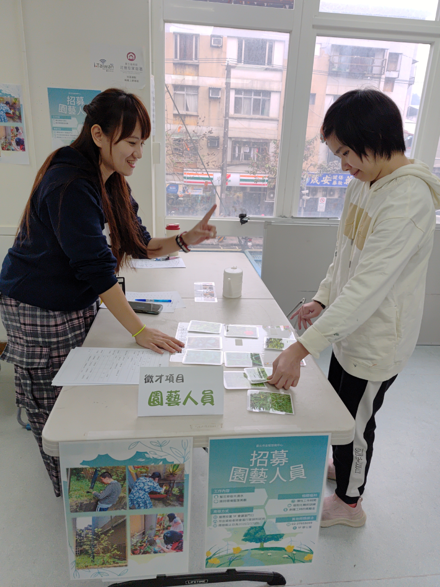這場特別的面試場景,來自金龍發展中心舉辦的第一屆就業博覽會。為了讓服務對象有更多元的工作選擇,除了原本的清潔工作外,中心新增了「園藝人員」、「倉儲人員」、「租借管理人員」、「接線人員」等職缺,讓有工作意願的服務對象都能嘗試,一圓就業夢。