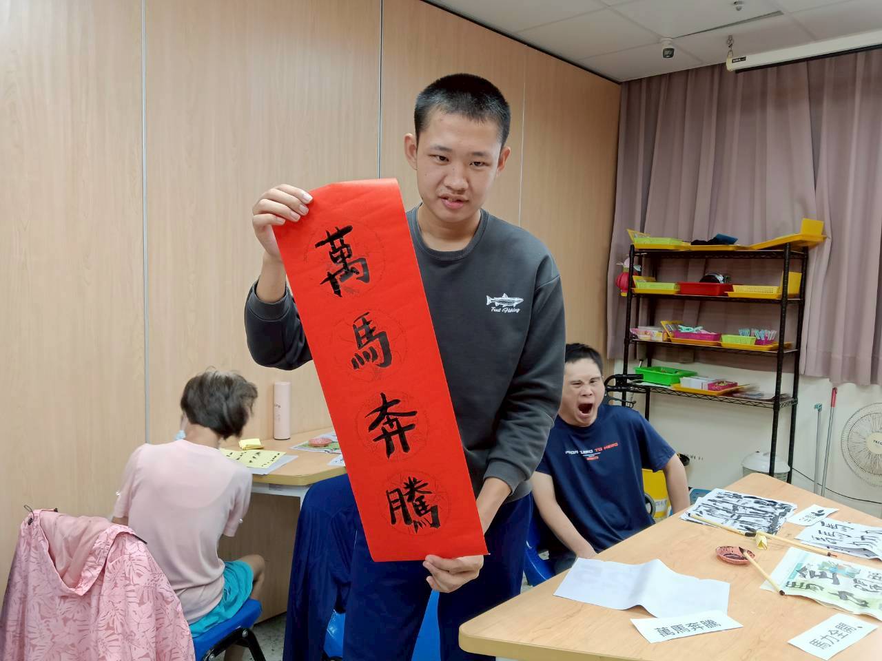 為了參加心路一年一度春聯徵選活動,他花了一個多月練習,當他終於在紅紙上揮毫寫下「萬馬奔騰」時,不忘畫上一匹充滿朝氣的駿馬,回應老師的叮嚀:「要有設計感」。