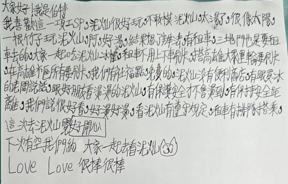 親眼看到泥火山,我好開心,以前聽理化老師說,看泥火山很像看太陽的感覺。看著泥火山冒火,感覺耳朵也變得熱熱的,雖然害怕,但有機會我還會想再去。