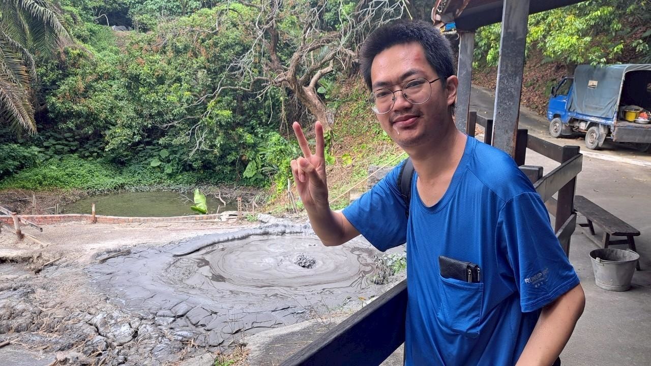▲親眼見到泥火山的伯特,開心比出勝利的手勢。