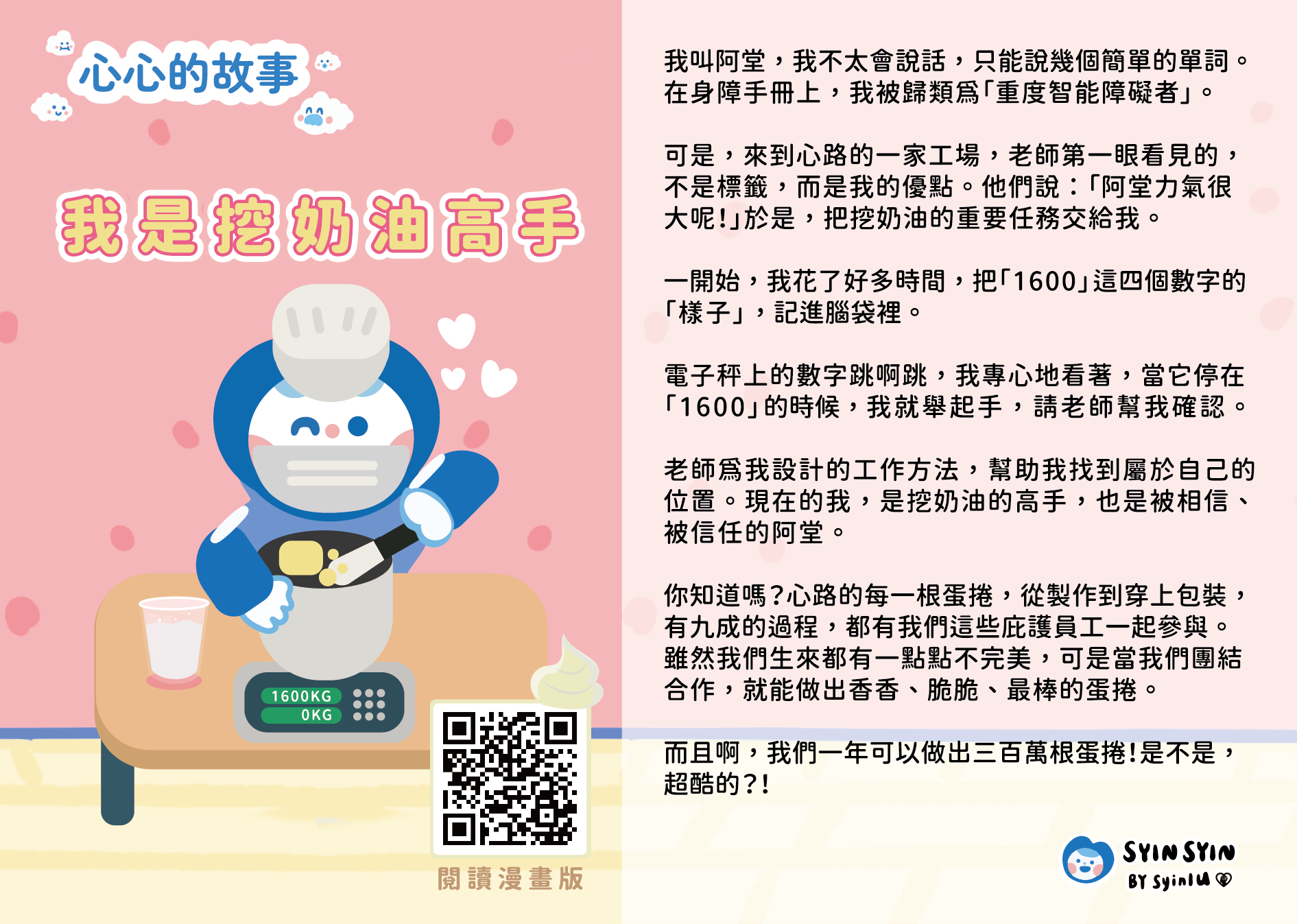 可是,來到心路的一家工場,老師第一眼看見的,不是標籤,而是我的優點。他們說:「阿堂力氣很大呢!」於是,把挖奶油的重要任務交給我。